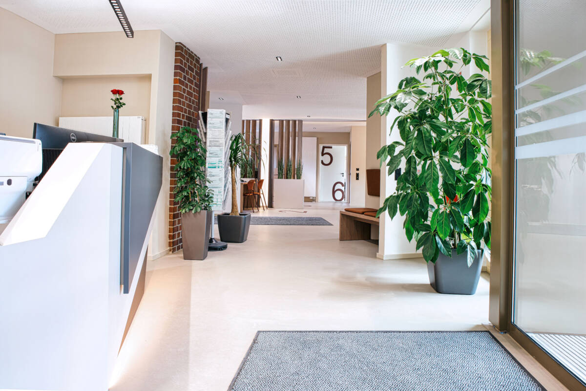 Das neue Bürgerbüro vereint Funktionalität, Aufenthaltsqualität und ein klares architektonisches Konzept. Helle, lichtdurchflutete Räume, ein durchgängiges Material- und Farbkonzept in erdigen Tönen sowie warme Holzoberflächen schaffen eine freundliche Atmosphäre. Eine sichtbare Klinkerwand erinnert an den Gebäudebestand und verleiht den Räumen Identität. Offene Bürobereiche werden durch geschlossene Büros ergänzt und ermöglichen sowohl Diskretion als auch Transparenz. Modernste technische Ausstattung – darunter Point-ID-System und Kassenautomat – sorgt für effiziente Abläufe und kurze Wartezeiten.
