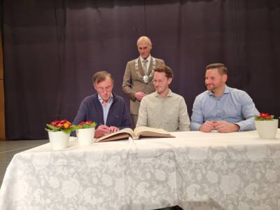 Die erfolgreichen Radballer Thomas Kieferle und Martin Egarter und ihr Trainer Alfred Keller trugen sich ins Goldene Buch der Gemeinde Kissing ein. Für Unterhaltung sorgten die Jugendgarde des FKM Lach Moro und das Duo Dieter und Irmi mit Livemusik und Gesang